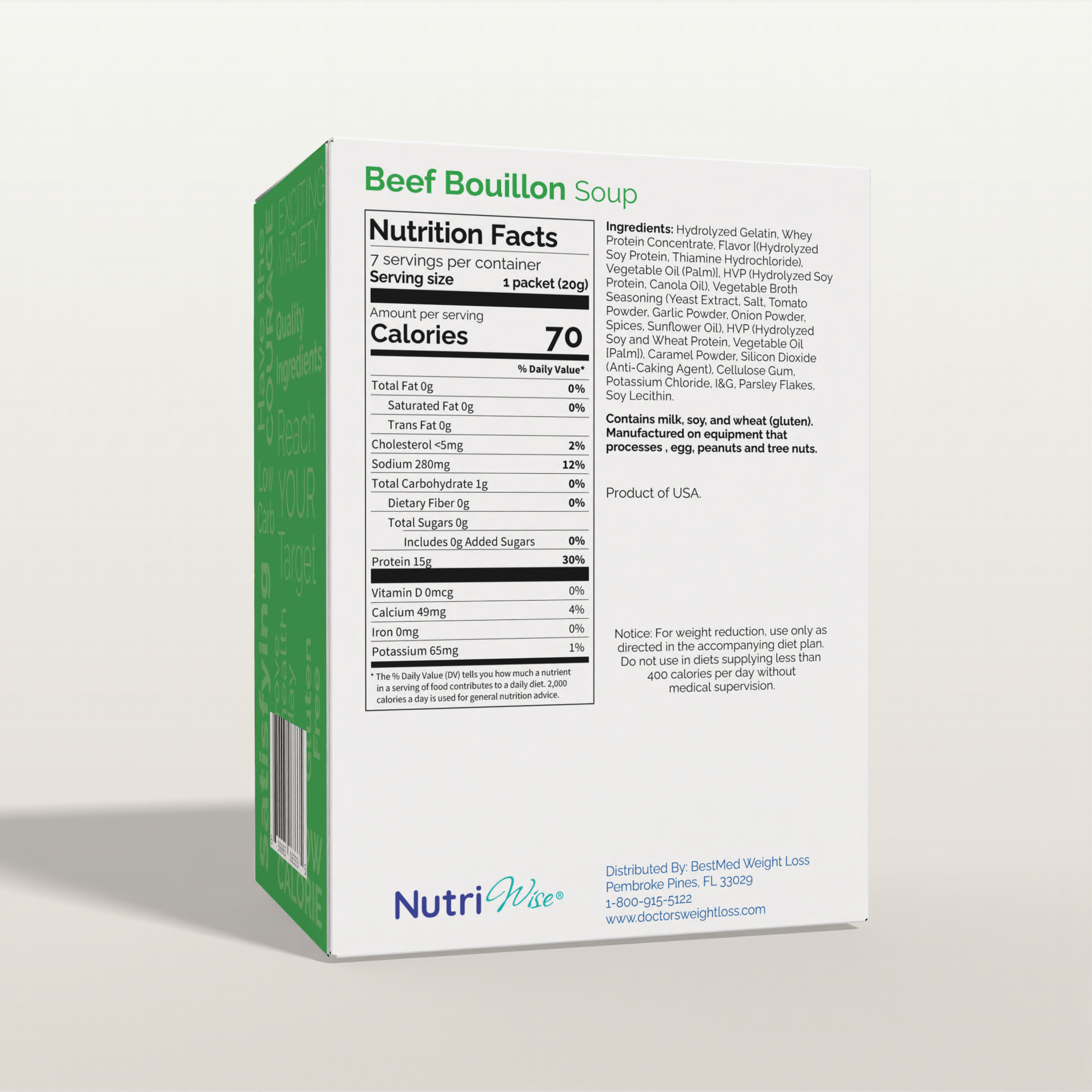 Savor the delicious burst of flavors in NutriWise Beef Bouillon Soup, a versatile option perfect for lunch, dinner, or enhancing your culinary creations as a stock! With a generous 15g of protein and a mere 70 calories, this soup not only satisfies your craving for something warm and salty but also makes a healthy choice to support your dietary goals.