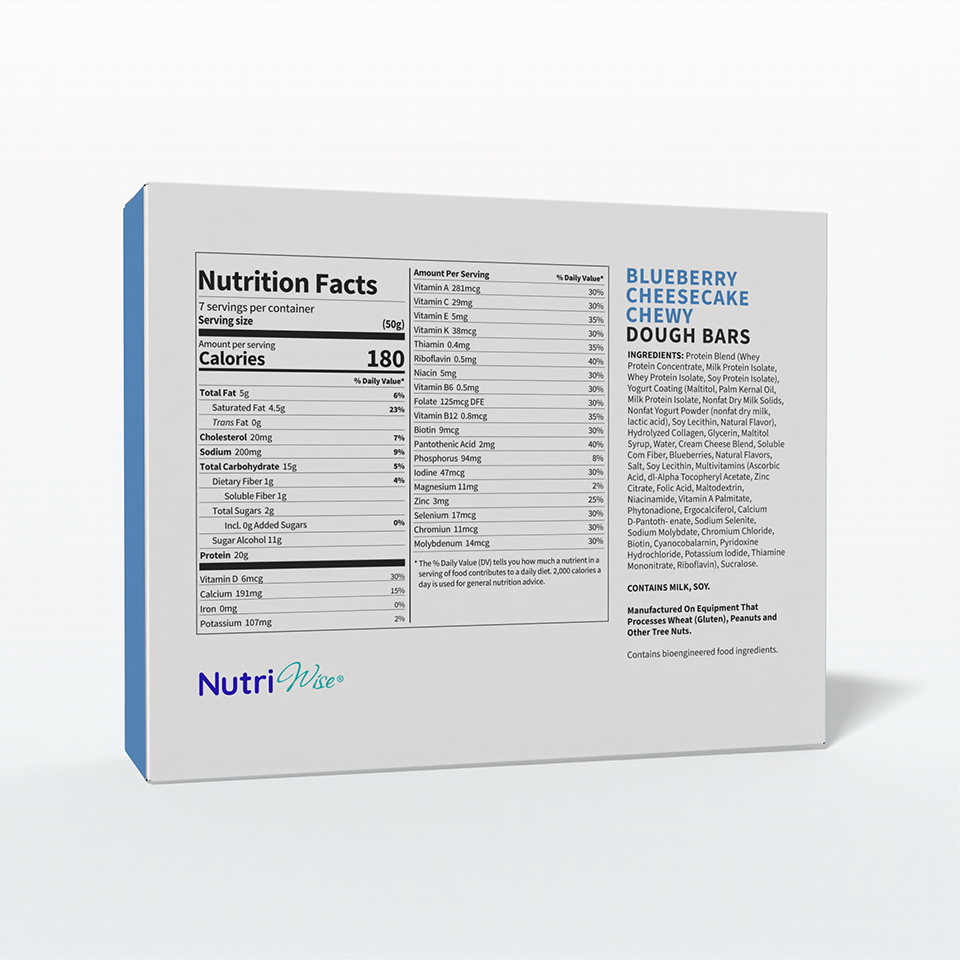 Indulge in the delicious taste of Chewy Blueberry Cheesecake Dough Bar, a perfect blend of sweet blueberries and creamy cheesecake flavor wrapped in a soft, chewy texture. This protein-packed bar is designed to satisfy your cravings while supporting your nutritional goals. With a balance of protein and fiber, it helps keep you feeling full and energized throughout the day—whether as a quick breakfast, midday snack, or post-workout boost. Can be used as a quick snack or total meal replacement.