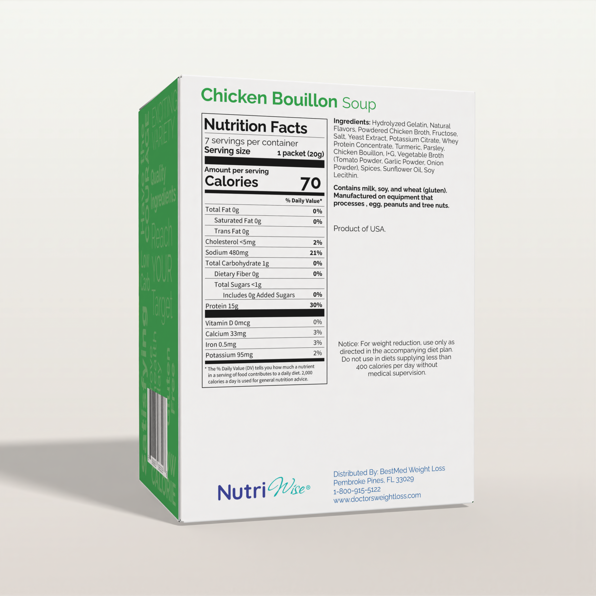 Indulge in the warmth and savory delight of NutriWise Chicken Bouillon—a perfect choice for those craving a wholesome and satisfying soup. Say goodbye to high-calorie and fat-laden store-bought soups, and embrace the guilt-free goodness of this option, boasting only 70 calories, 0g of fat, and a generous 15g of high-quality protein. Elevate your soup experience with NutriWise Chicken Bouillon, leaving you both satisfied and guilt-free!