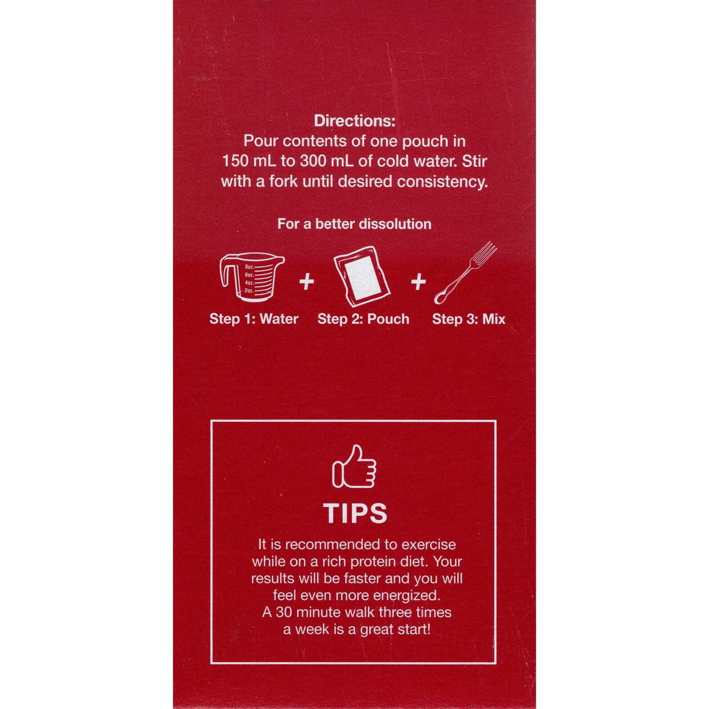 - Add the contents of one pouch to 5 ounces of cold water.